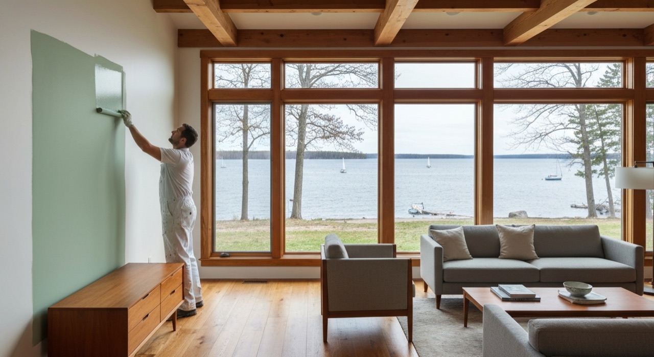 Callander Bay lakefront cottages. Vaulted great rooms with exposed beams. Highway 11 corridor year-round homes. Pre-listing seasonal repaints for second-home owners. Benjamin Moore and Dulux, two coats over full prep, with a 1-year written warranty.